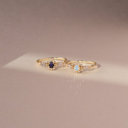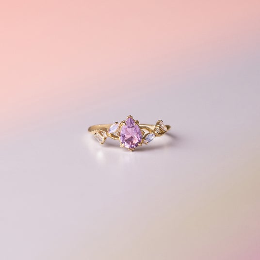 -Ring-コンケープカットを施したアメジストを中心に、煌めく小さな星々をイメージしたダイヤモンド、柔らかな輝きのホワイトラブラドライト、シャープなカットのクォーツで飾り、オーロラが浮かぶ夜空の情景を表現しました。