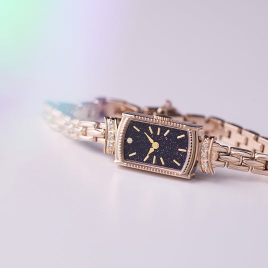 -Watch-夜空そのものを閉じ込めたような紫金石の文字盤に、煌めく小さな星空をイメージしたダイヤモンドをひとつ。光のカーテンが軽やかに踊る様子をイメージして動きをつけたラグは、ダイヤモンドが煌めき手元に優雅な表情を添えます。