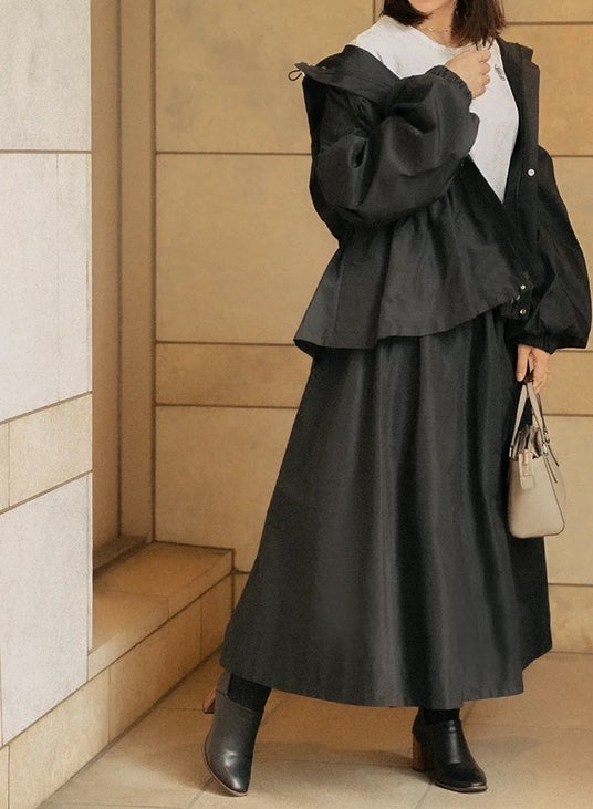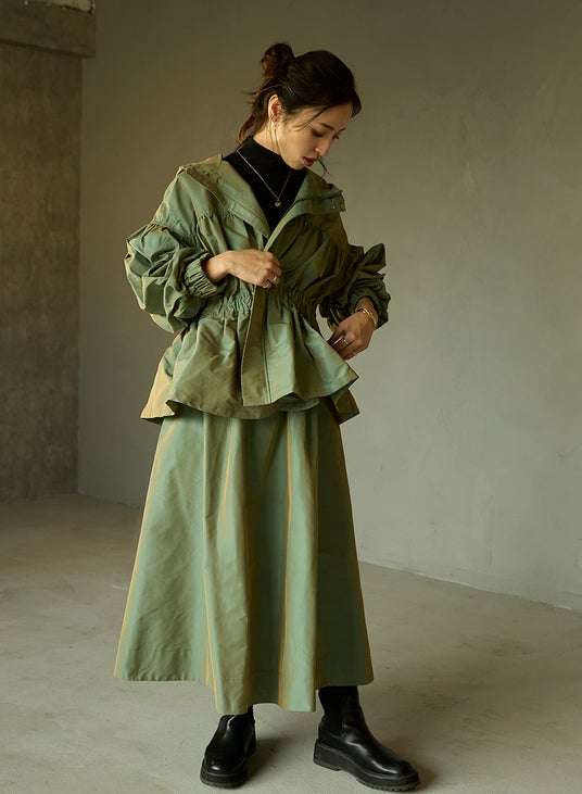 たっぷりとした袖とフードが特徴的なアウターと、ギャザーを施した程よいボリューム感と、ハリがポイントのロングスカートを数量限定でセット販売いたします。