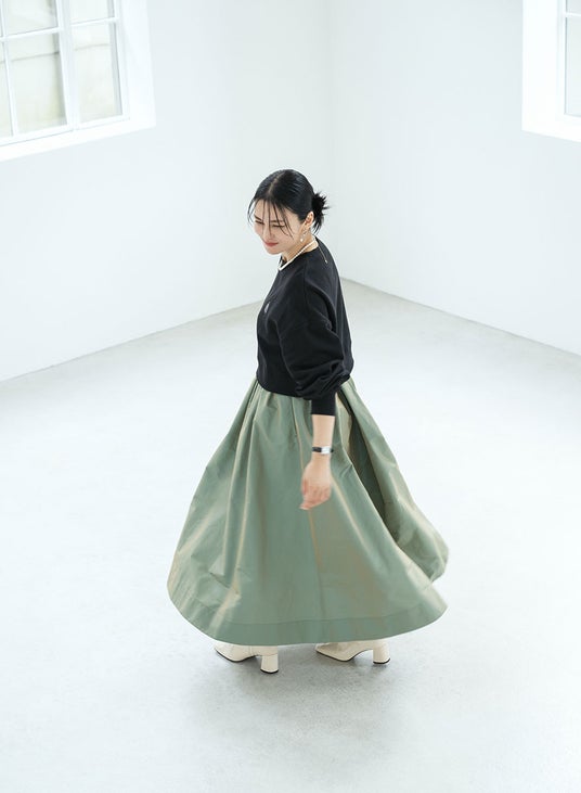 LOOK BOOK第2弾の公開に併せて公式サイトのKV(キービジュアル)第3弾を公開。第3弾はスカートとスウェットのスタイル。タマムシ(KHAKI)色のスカートは動くたびに優美なシルエットを描き、秋冬の柔らかな光を受けて深みのある輝きを放ちます。時を経ても変わらないシンプルなデザインの中にさりげないアクセントが加わり、心地よさと洗練された雰囲気を纏えるスタイルです。