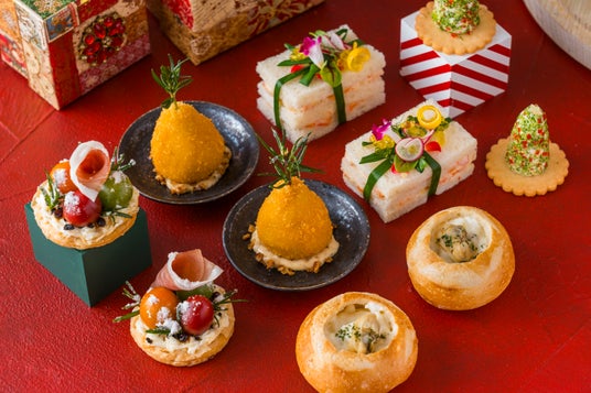 5種類のセイヴォリーもクリスマスをモチーフにした装いで登場し、目と舌を楽しませます。海老とマヨネーズを和えて重ねたサンドイッチをグリーンオニオンで巻き、まるでクリスマスのプレゼントボックスのように仕上げた「シュリンプ・ギフトボックス」、丸いミニサイズのサワードウをくり抜き、じゃがいも、玉ねぎ、にんじん、セロリをリッチクリームで仕上げた温かいクラムチャウダーを詰めた「チャウダーミニポット」、カッテージチーズ、エメンタールチーズ、クリームチーズの3種類をブレンドした自家製チーズにレーズンとドライクランベリーを忍ばせ、ブロッコリーパウダーを用いてクリスマスツリーを再現した「クリスマス・チーズ・ツリー」など、シェフが腕を振るう華やかな5品をゆっくりとお楽しみいただけます。