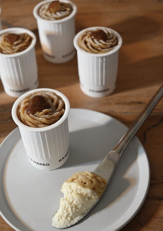●〈P.P.HAKKO〉 モンブラン・ラテ 税込756円(2個入り)1,512円(4個入り) まろやかなカフェラテムースの上に栗のペーストを絞りました。