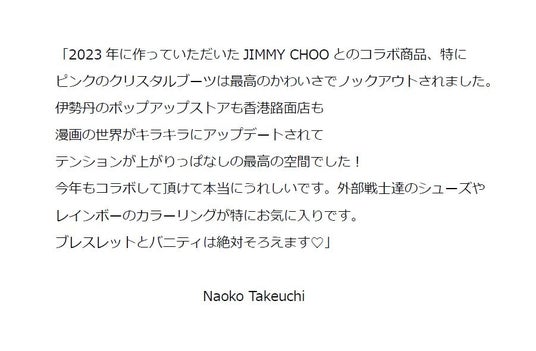 「私はセーラームーンが表現するものが大好きです。女性から生まれるパワー、チームワークによる力強さ、善良なものを守るという信念。セーラームーンがいかに世界中の多くの人々に感動を与え、インスピレーションを与えているか、世代を超えたファンの純粋な愛に驚かされ続けています。この深く豊かな創造世界のスーパーヒロインたちとのコラボレーションは、私にとってエキサイティングなことでした。物語・キャラクターを真に理解し、素晴らしい世界を夢見させてくれるポップ・アイコンとしてのセーラー戦士のアイデアに敬意を表することにこだわりました。」