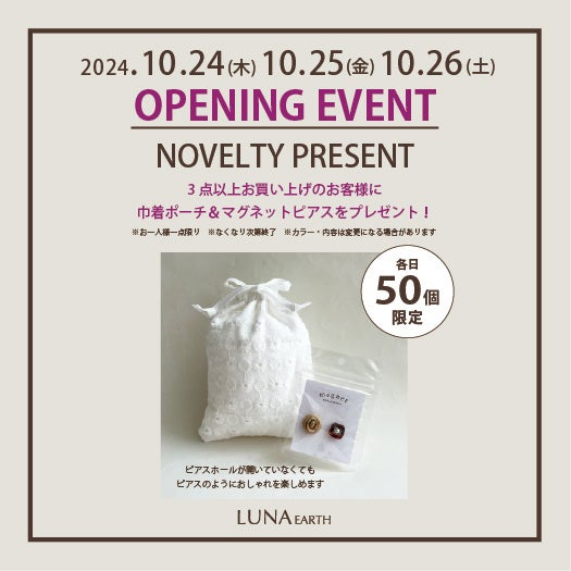 商品を3点以上お買い上げのお客様に、巾着ポーチ&マグネットピアスのセットをプレゼントいたします。