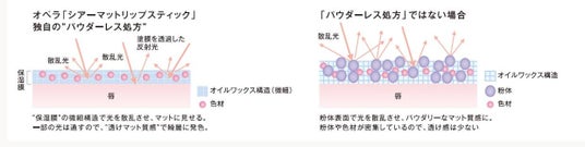 従来ツヤ消しに使われる粉体を用いて‘完璧なマット’にするのではなく、リップケア素材の中から光沢の少ないものを厳選してブレンドした、すりガラスのような質感の‘保湿膜’に、美しい色を溶け込ませた独自処方。唇に乗せると、しっとりとなじんで透けるように色づき、ひと塗りで、ふわりとブラーリングされた‘透けマット’質感を叶えます。