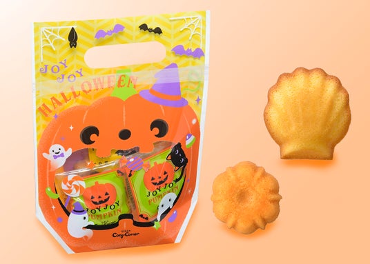 特長:ジャック・オ・ランタンの口から袋の中が見えるようなデザインのバッグに、バターマドレーヌとフラワー型のパンプキンケーキをアソート。
