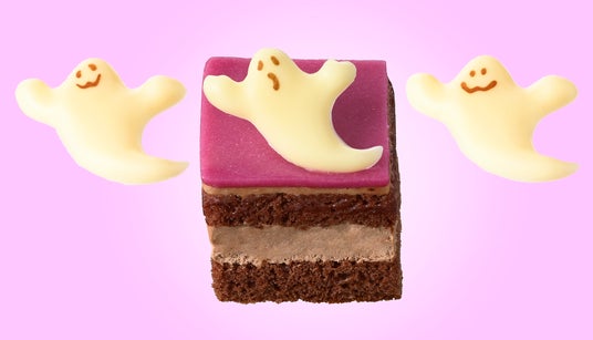 ▶「いたずらゴーストケーキ」のチョコプレートの顔は3種類。ランダムに入っています。