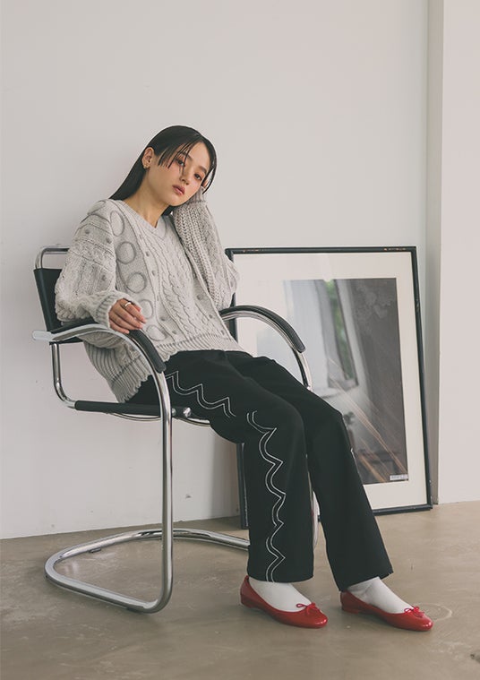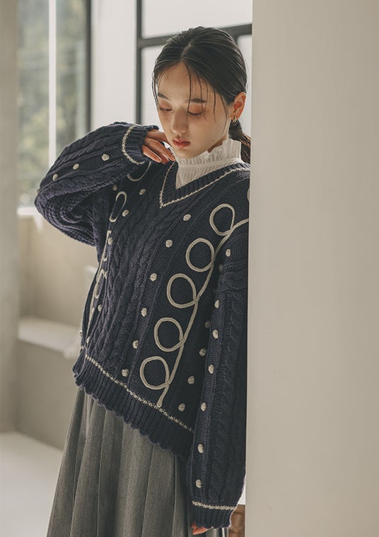 コード柄の刺繍でくるくるとしたラインを表現したケーブル編みニット。遊び心のある配色のラインに加え、立体的な丸いポイント、裾・袖口はスカラップ仕立てで細部にもこだわりました。
