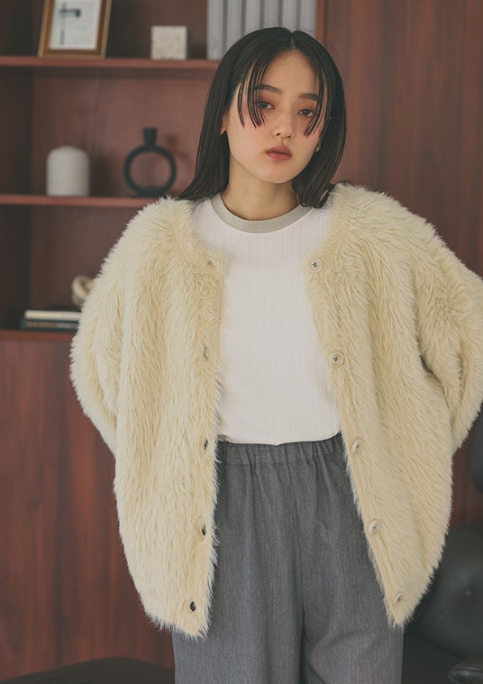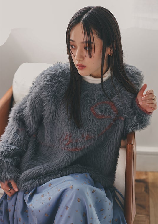 リボンモチーフが目を惹く前後2wayの、ふわふわとした心地良い肌触りが魅力のシャギーカーディガン。片面にはラメ糸でリボンとロゴをあしらい、ポイントにしました。ゆるっとしたシルエットで楽に着用できます。