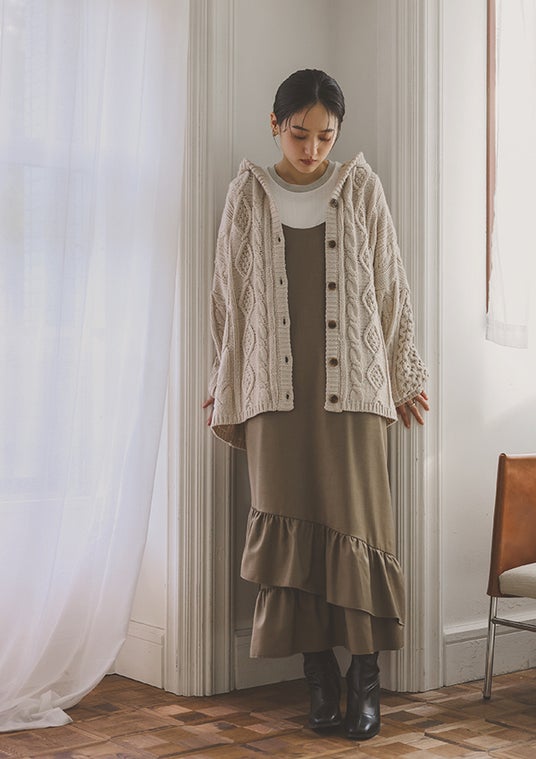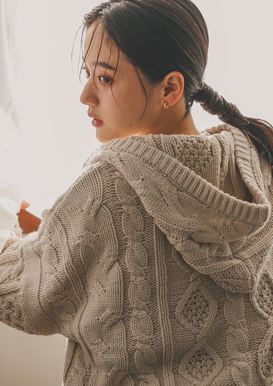 ゆるっとしたフーディーとぽわん袖が大人可愛い、ニットケーブル編みのパーカーカーディガン。身頃と袖で編み柄を切り替えた、こだわりのデザインです。べっ甲風の特徴的なボタンがポイント。抗ピリング加工で毛玉を防止し、自宅で手洗いが可能です。