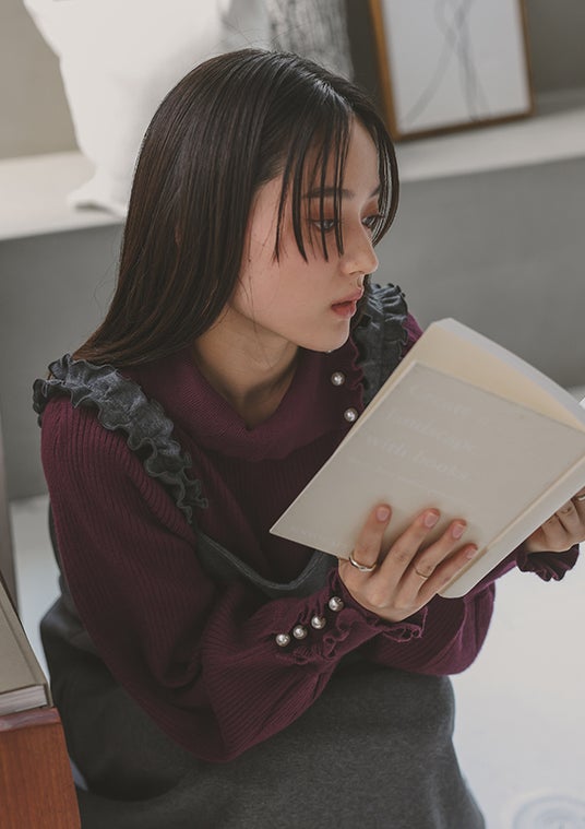 襟元・袖口にあしらったフェイクパールとフリルで、フェミニンな雰囲気を醸し出すもっちりとしたニットトップス。アシンメトリーに折り返した襟元やぽわん袖がアクセントになりつつ、定番で着用しやすいサイズ感とシルエットで着回しに活躍します。リブ編みでしっかりした伸縮性があります。
