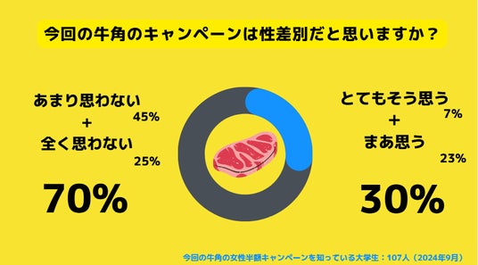 ■大学生のうち、70%が牛角の女性半額キャンペーンは性差別でないと回答