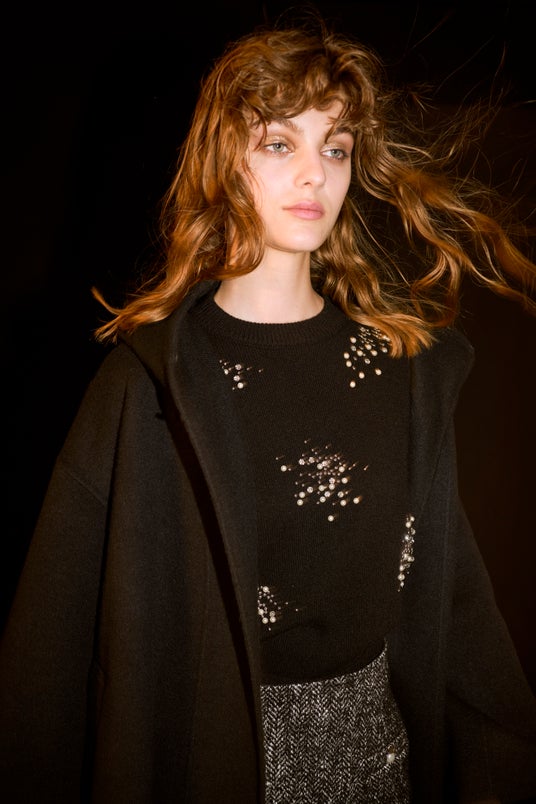 秋冬第三弾となるヴィジュアルLOOKでは、トレンド感のあるふんわりとしたループ状素材のミドルコートとラメの煌めきが華やかなニットのセットアップ、ビジューが散りばめられたニットなどが登場。