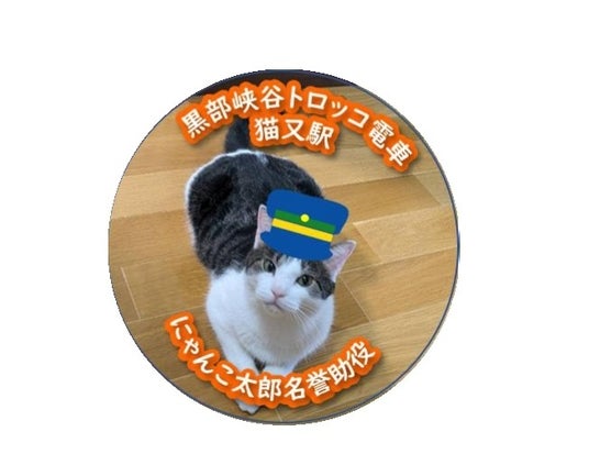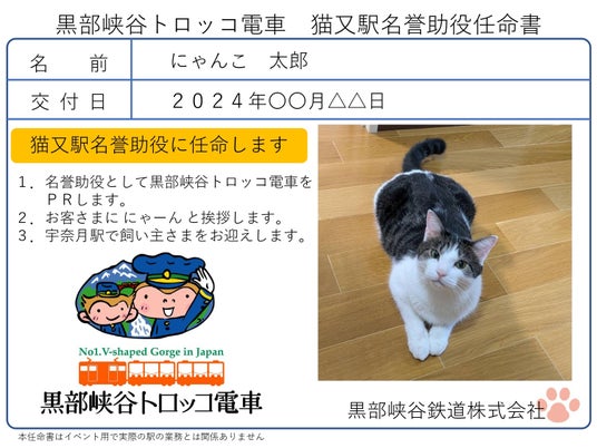弊社ではこれを機に、広く「猫又駅」を知っていただこうと、猫の「名誉助役」任命企画を実施することといたしました。この企画は、お客さまより愛猫をご推薦(写真送付)いただき、弊社より愛猫の写真入り「任命書」と「缶バッジ」を交付(プレゼント)させていただくものです。この「任命書」と「缶バッジ」は宇奈月駅2階に掲出され、ご推薦のお客さまはトロッコ電車ご乗車後にお持ち帰りいただくこととしております。愛猫の可愛らしい「名誉助役」姿はきっとよい記念になるものと思っております。