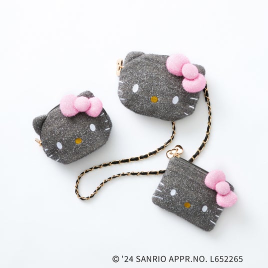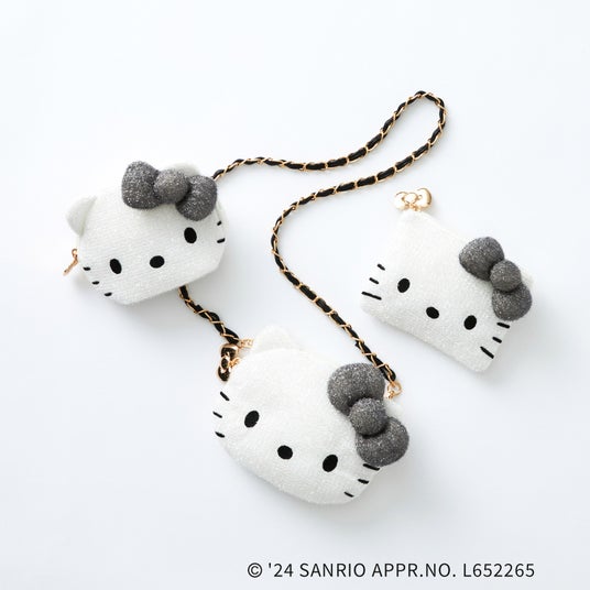 ハローキティのお顔を立体的に表現したフェイス型のミニショルダーバッグとポーチ、ハローキティのアイコンでもあるリボンを立体的に表現したスクエア型ポーチの全3型です。