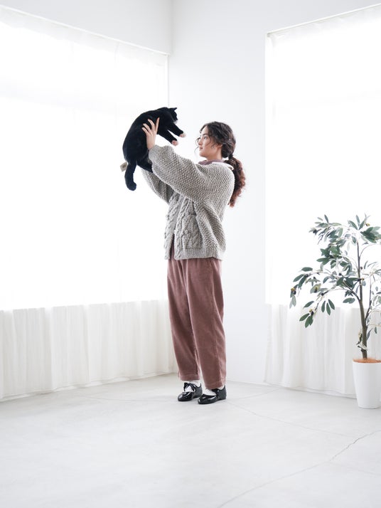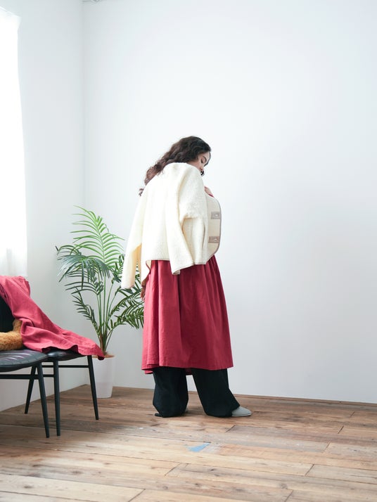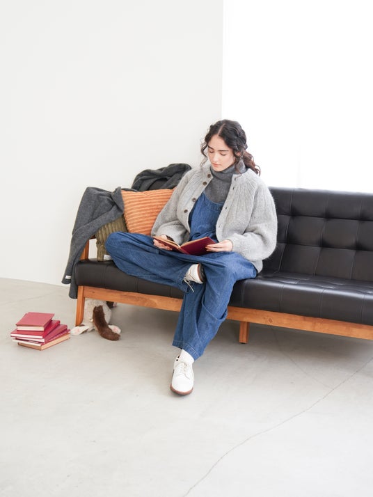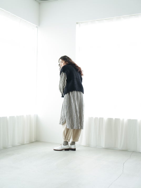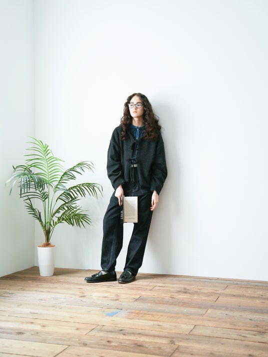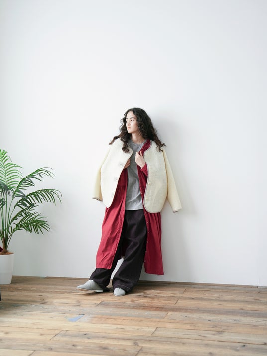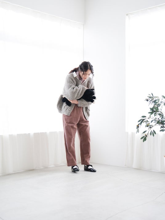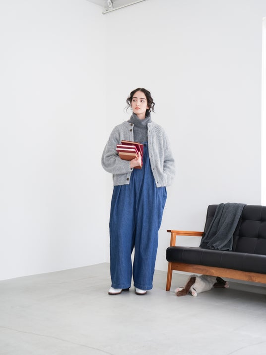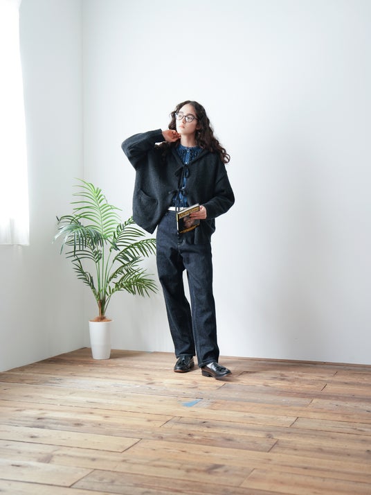 素材を活かしたシンプルなデザインの為、ニットカーディガン感覚でラフに着用していただくのがおすすめです。