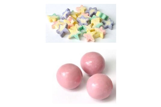 カラフルな星型のお麩チョコ(上)とピンク色のいちご風味チョコ(下)