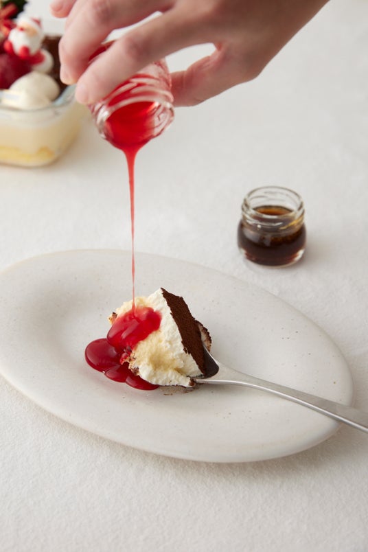 Tiramisu No.6の「いちごのクリスマスティラミス」は、濃厚で滑らかなマスカルポーネに甘酸っぱいいちごと可愛らしいサンタクロースのデコレーションを施し、見た目も華やかな一品に仕上げました。小さなお子様でも安心して召し上がれるよう、エスプレッソソースは別添えにし、クリスマスらしいいちごのソースもお付けしました。飽きのこない味の変化をお楽しみください。