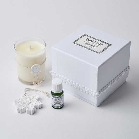 2024年限定デザインのアロマキャンドル。BALLONのクリスマステーマの香りであるWINTER FORESTの香りです。白のブレードつきのギフトボックス仕様。