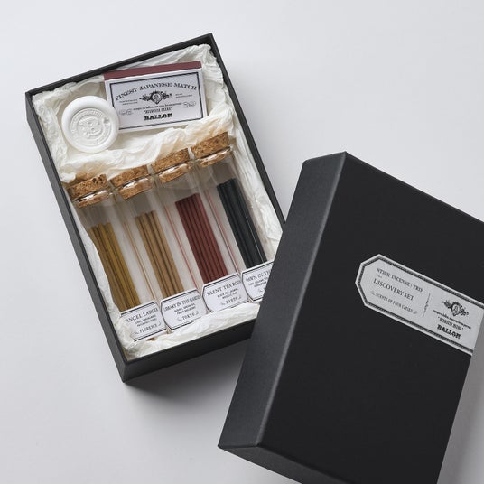 セット内容: STICK INCENSE-TRIP-各6本ずつ ANGEL LADDER < FLORENCE >/ LIBRARY IN THE GARDEN < TOKYO >/ SILENT TEA ROOM < KYOTO >/ DAWN IN THE CITY < PARIS > / インセンススタンド × 1個 / 特製マッチ 20本入