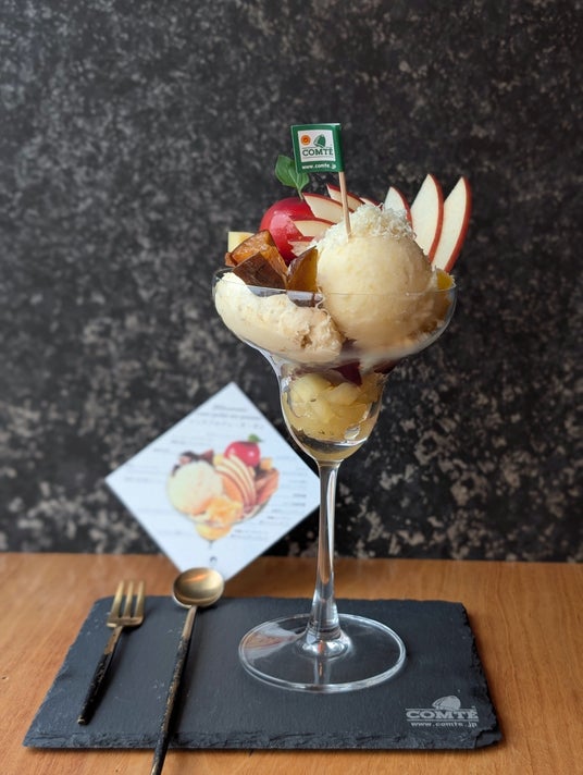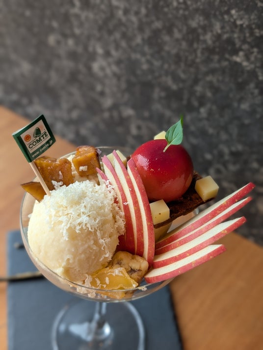 コンテは、フランス東部のジュラ山脈一帯で、1000年以上も前から添加物を一切使わずに作り続けられているチーズ。今回のパフェに使用されている若い熟成のコンテは、フルーティーで花の香りやバター風味のマッシュポテトのような豊かな風味が広がります。