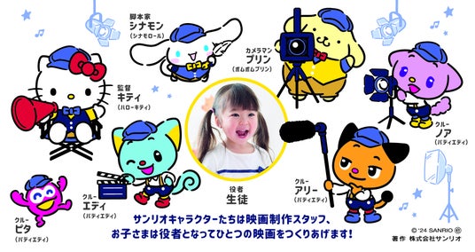 舞台は映画の制作現場。役者となった子どもたちとハローキティ、シナモロール、ポムポムプリンと、Sanrio English MasterでおなじみのBUDDYEDDY(バディエディ)の仲間たちで毎月1本の映画を作り上げます。それぞれハローキティが監督、シナモロールが脚本家、ポムポムプリンはカメラマン、BUDDYEDDY(バディエディ)たちが映画クルーとして授業を盛り上げます。