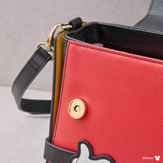 「ミッキー」のお洋服を連想させるレッドカラーのポケットにシルエットモチーフを正面・サイドにさりげなくデザイン。「ミッキー」が笑っているフェイスを型押しで施した、見ているだけで元気をもらえそうなアートデザインにも大注目。