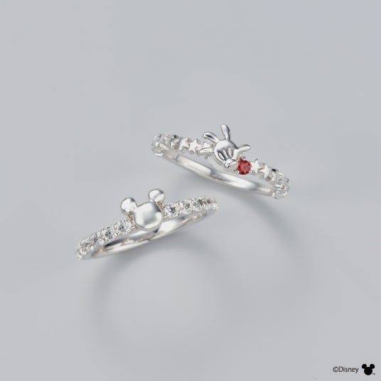 「ミッキーマウス」と「ミッキーマウス」の手のシルエットが愛らしく、ストーンの中央にセッティングされた「ミッキーマウス」のシルエットが、遊び心溢れるデザイン。手のシルエットには星のモチーフと、「ミッキーマウス」洋服の色をイメージした赤のストーンを添えアクセントに。細身のリングは重ね付けにもぴったり。「ミッキーマウス」のようなハッピーな気持ちになれる、さりげなくも洗練されたデザインのジュエリーです。