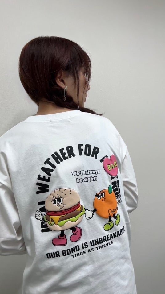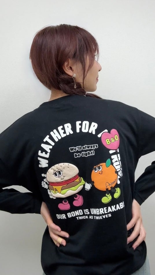 さらにTシャツのバックには、今回のコラボのためにデザインしたハンバーガーとオレンジを擬人化したキャラクターが登場しています。