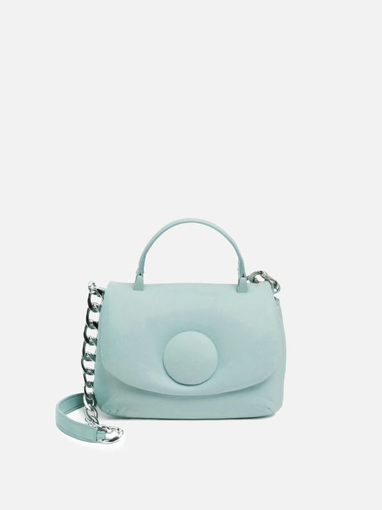 カラーはピンク、ライトブルー、ライトグリーンの華やかなソルベカラーと、オーク、ダークグレー、ブラックのシックなカラーの6色をご用意。モード感が漂う色彩で秋冬の装いにエッジを効かせ、旬なスタイリングの主役としても活躍します。ハンドルとバッグをつなぐパーツはレザーと同色に統一し、さりげなく馴染むように仕上げているため、ポップな印象です。