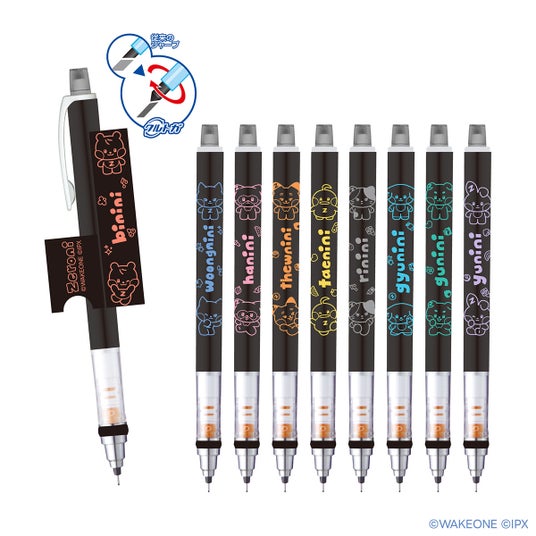 ブラックの軸に各キャラクターのイメージカラーでプリントされた、シンプルで使いやすいデザインです。