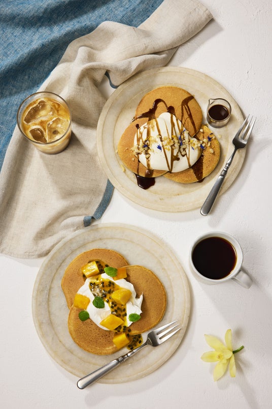 全粒粉を使用した香ばしい生地に、濃厚なマカダミアナッツクリームとコーヒーメイプルシロップを添えた一品。