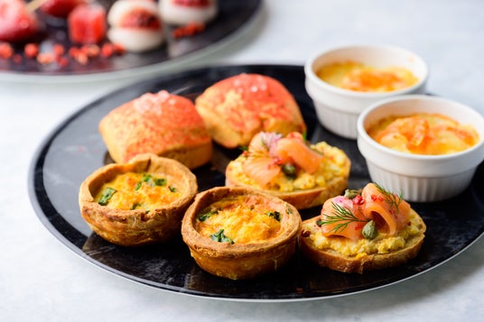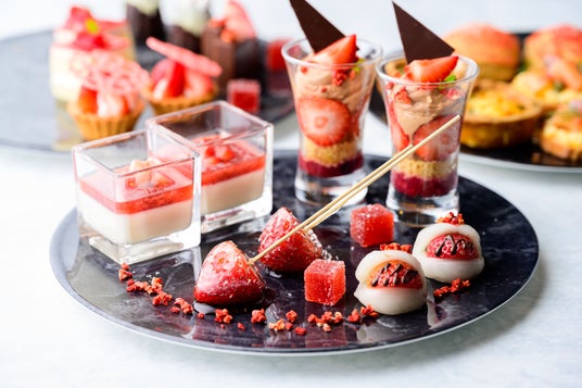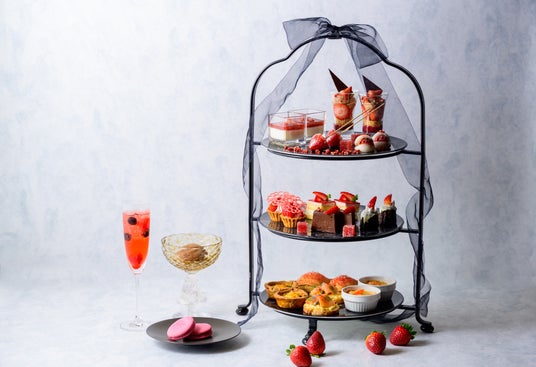 苺の赤色が映える黒色のスタンドには、コロンとした見た目が可愛いいちごあめや、フレッシュな苺やチョコレートクリーム、サクサク食感のクランブルが層になったグラスパフェ、定番のショートケーキなど、ガーリーで可愛らしい8種類のスイーツが並びます。また、特別コラボレーションとして、富山県の人気フランス菓子専門店「Monsieur J(ムッシュー・ジー)」の人気スイーツ3種類も登場します。特にテリーヌショコラは、フランス産最高級クーベルチュールチョコレートを100%使用し、なめらかで上品な甘さが特長です。スタンドの下段には、レムラードソースの程よい酸味とピンクペッパーのスパイスが効いた爽やかなスモークサーモンのブリュスケッタなどお口直しにもちょうどいい4種類のセイボリーが並びます。