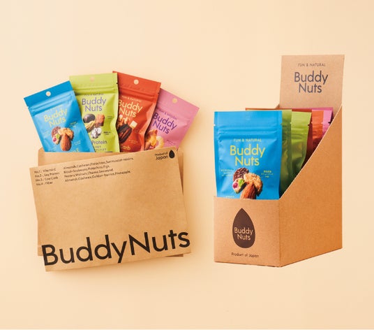 BuddyNutsは、2022年6月に販売を開始したブランドです。代表である亀岡が、健康診断で異常が見つかったことがきっかけで栄養価の高いナッツを喫食するようになり、「毎日飽きずに食べられる、楽しいミックスナッツを作りたい」という想いからブランドがスタートしました。