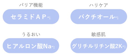 *1 皮膚コンディショニング成分 *2 セラミドAP・ヒアルロン酸Na・バクチオール・グリチルリチン酸2K(すべて皮膚コンディショニング成分)