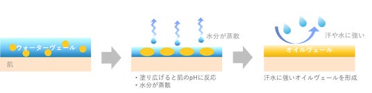 肌のpHに反応してオイルヴェールを形成し、汗や水に濡れてもUVカット効果が持続します。