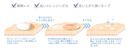 肌への負担を極力減らす処方にこだわった特殊な乳化成分を採用。肌に乗せるときには、ぷるんとみずみずしいクリーム状で摩擦を軽減。その後、素早くオイル状に変化しメイク汚れをキャッチ。油性マスカラなどしっかりメイクもきちんと落とせます。潤いを残ししっとりとした洗い上がりで、すすぎ過ぎによる乾燥を防ぎます。