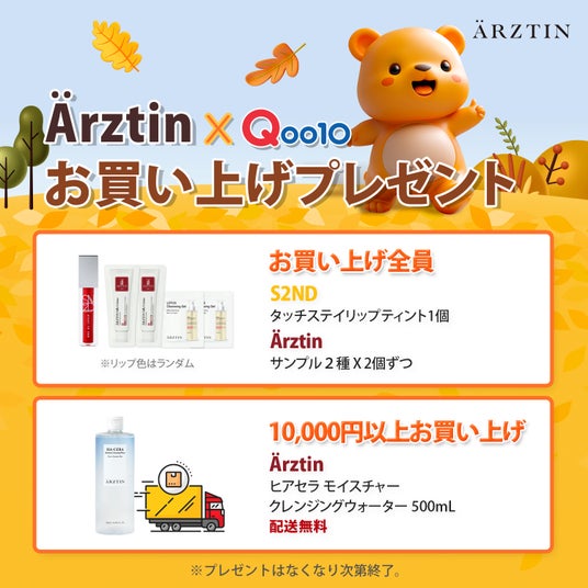 今回のエルツティンQoo10公式ショップのメガ割では、最大30%OFFとお買い上げの方全員には「S2NDタッチステイリップティント1個(色ランダム)+ARZTINサンプル2種2個セット」が、1万円以上のお買い上げプレゼントは「ARZTINヒアセラ モイスチャークレンジングウォーター現品」と500円クーポン発行そうして送料が無料のチャンスなどプレゼントがたくさんもらえます。