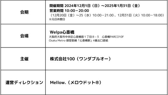 株式会社100(代表取締役 山上博子)は、2024年12月1日(日)~2025年1月31日(金)の期間、心斎橋PARCO10階医療ウェルネスモール「Welpa(ウェルパ)」エリア内にて、フェムテック×多様性をテーマとしたPOP UPストア&イベント「FEMTECH&」を開催することをお知らせいたします。