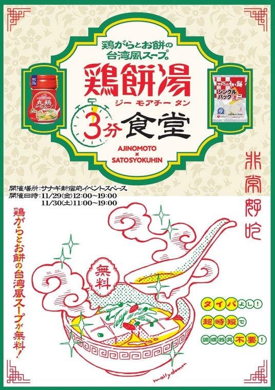 この度、この新メニューをより多くの方に知って頂くため、11月29日(金)・30日(土)の2日間限定で「鶏餅湯」を無料で提供する「鶏餅湯 3分食堂」をサナギ新宿(新宿区新宿三丁目35番6号 国道20号線 高架下)にてオープンします。