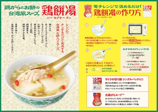 「鶏餅湯(ジーモアチータン)」は、「サトウの切り餅シングルパックミニ」に「丸鶏がらスープ(TM)」と水を加え、レンチンするだけで“3 分で完成”する台湾風餅入りスープ。味の素社と共同で考案しました。