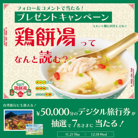 また、本日11月21日(木)~12月18日(水)の期間中、サトウ食品の公式インスタグラムアカウントをフォロー&「鶏餅湯」の読み方をコメントしていただくと、抽選で7名様に50,000円分のデジタル旅行券が当たるプレゼントキャンペーンも開催します。