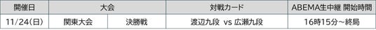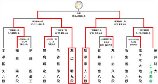 「将棋日本シリーズ JTプロ公式戦」(以下「JT杯」)決勝戦(関東大会)は、通算4度目の優勝を目指す渡辺明九段と藤井聡太JT杯覇者を準決勝で下して5年ぶり2回目の決勝進出を決めた広瀬章人九段の対局。東京都江東区の東京ビッグサイト東展示棟4・5ホールで開催される。事前申し込みにて当選した観戦者や同会場で開催される「テーブルマークこども大会」参加者の目の前で、公開対局として熱戦が繰り広げられる。また、その模様は16時15分からABEMAでも生中継される。