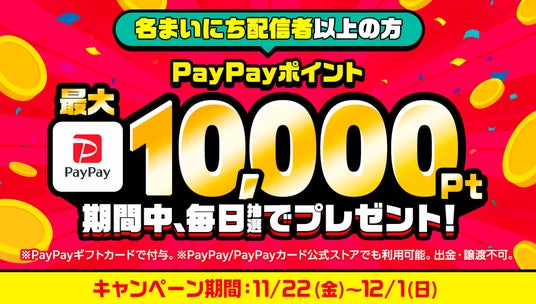 11月22日(金)時点で「名まいにち配信者」以上の方を対象に、毎日抽選でPayPayポイントが当たるキャンペーンを実施!