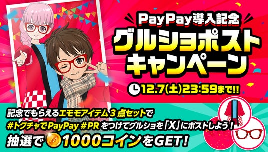 支払い方法に「PayPay」を導入したことを記念して、エモモセット(はっぴ、メガネ、背景)を使ったグループショットを撮影して、「#トクチャでPayPay」を付けてXに投稿すると、抽選で1,000名に1,000コインをプレゼント!