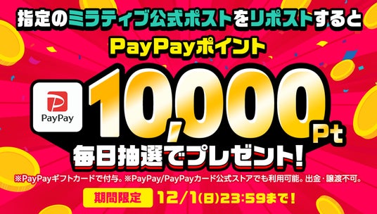 ミラティブ公式Xアカウントの指定ポストをリポストするだけで、毎日抽選で1名様に10,000円相当のPayPayポイントが当たるチャンス!