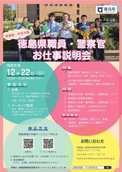 徳島県職員・警察官の業務に関心のある方や、お子様の将来の就職先の候補としてご検討の保護者の皆様のご参加をお待ちしています!