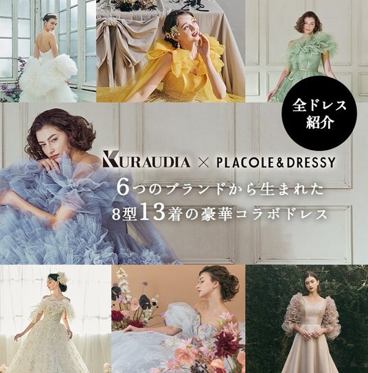 ウエディングドレス業界を50年間リードし続けてきたトップメーカー「KURAUDIA(クラウディア)」が、SNSを中心に花嫁のビッグコミュニティを展開する「PLACOLE & DRESSY」とタッグを組み、特別なコラボドレスコレクションを発表いたします。KURAUDIA(クラウディア)を代表する6つのハウスブランドから、8型13着のドレスがラインナップされるこのコレクションは、PLACOLE & DRESSYの総フォロワー数240万人を超える花嫁ユーザーの声を反映したものです。