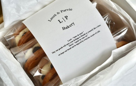 フランス料理人とパティシエの夫婦が営む、パンと焼き菓子の店「Lecre & Parvie(ルクレ&パルヴィ)」。オンラインストアで不定期で注文を受け、受注生産で一つひとつ手作りしています。「Lecre」は「甘い手紙」を意味する「sucre lettre」という言葉を、「Parvie」は「あなたの人生の一部」を意味する「partie de votre vie」という言葉を組み合わせて名付けられています。「贈り主の気持ちを届ける手紙のような焼き菓子を作れたら、そして、人生や生活の一部になるパン屋になれたら」という夫婦の思いが込められています。
