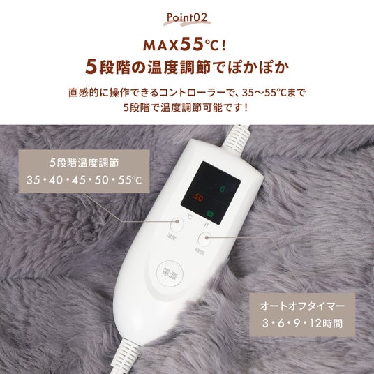 この電気毛布は、5段階の温度調節が可能で、直感的に操作できるコントローラーを備えています。温度は35℃から55℃まで調整できます。